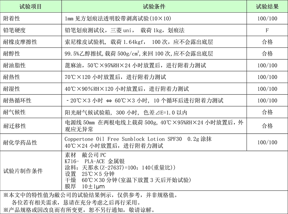 最近在质量方面企业意识日益增强,在涂膜的物理性质方面也在追求更高的质量,因此市场就需要在环境试验及耐化学品性等方面更优异的涂料。“PLA-ACE K716-系列”就是可适用这些要求的“PLA-ACE A716-系列”产品在耐迁移性、耐化学品性方面的升级版涂料。