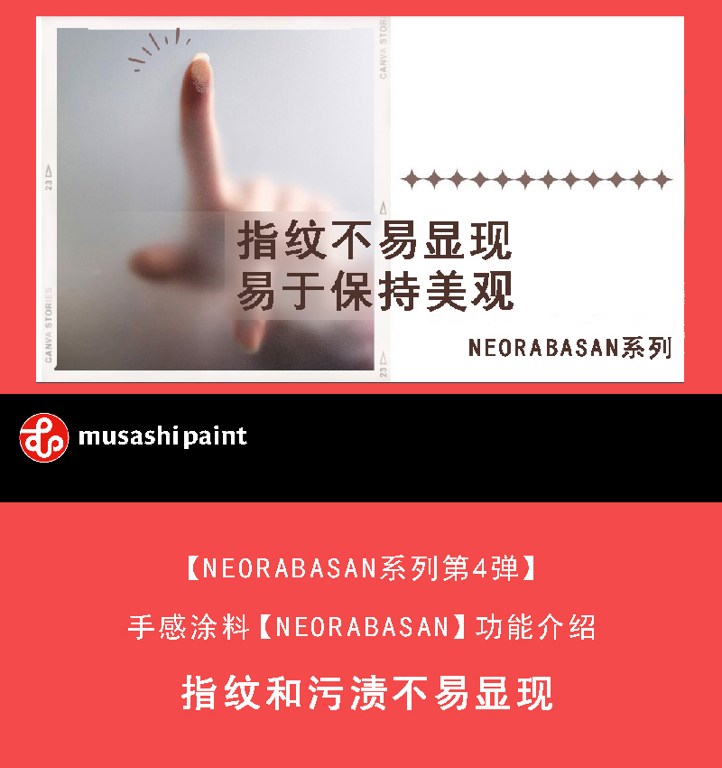 NEORABASAN是一种特殊的软触感涂料,耐水解。由于具有不易显现指纹的特性,与普通涂料相比,即使粘附指纹或手上污垢,其明显程度也会减少。指纹是由于含有皮脂和汗水等含有油分的指尖接触到表面而形成的,而NEORABASAN具有抑制这种附着的效果。