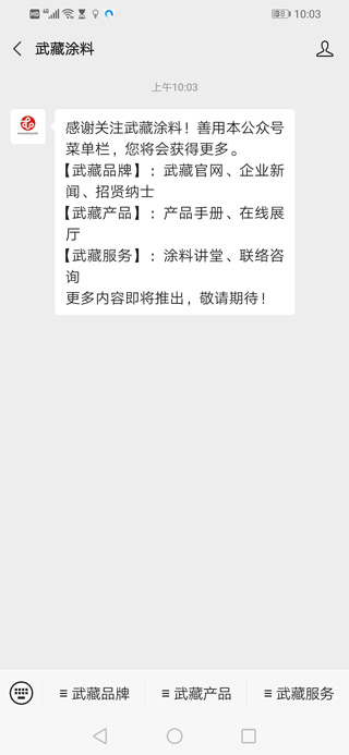 为了增强品牌建设,增加企业资讯的传播途径,弥补与客户存在的接触断点,强化与客户的互动。日前,武藏涂料微信公众号正式上线,该公众号有《武藏品牌》 《武藏产品》 《武藏服务》等多个常规模块,更有《在线展厅》 《涂料讲堂》等多个特色模块,后续会不定期更新相关内容,诚邀您的关注,期待与您在微信公众号上有更多的互动。