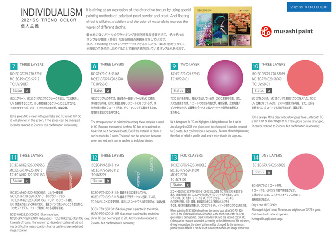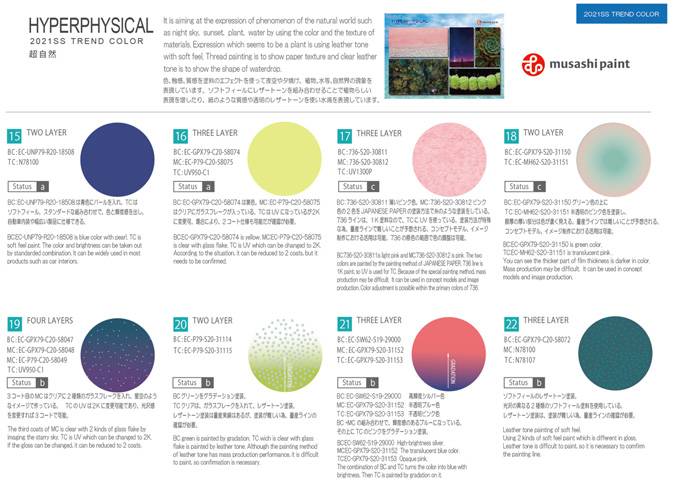 2020年仲秋,武藏涂料中国依据国际流行色委员会(International Commission for Color)所发布的6个品类共计56款趋势色,以涂料形式将其中3个品类共计22款颜色制作成色板对外发布,以此抛砖引玉供各相关行业的设计大咖碰撞灵感,启迪思维。