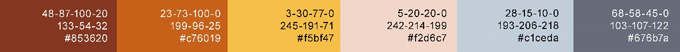 色彩分析:以橙红色和黄色为主,搭配中性色灰色,整体向暖色调倾斜,给人有炎热、怀旧的印象。