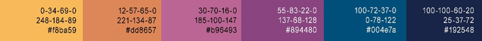 色彩分析:蓝色于紫色在色相环上相邻,再搭配橙黄色则变为对决型配色,常给人欢快、梦幻、华丽的印象。