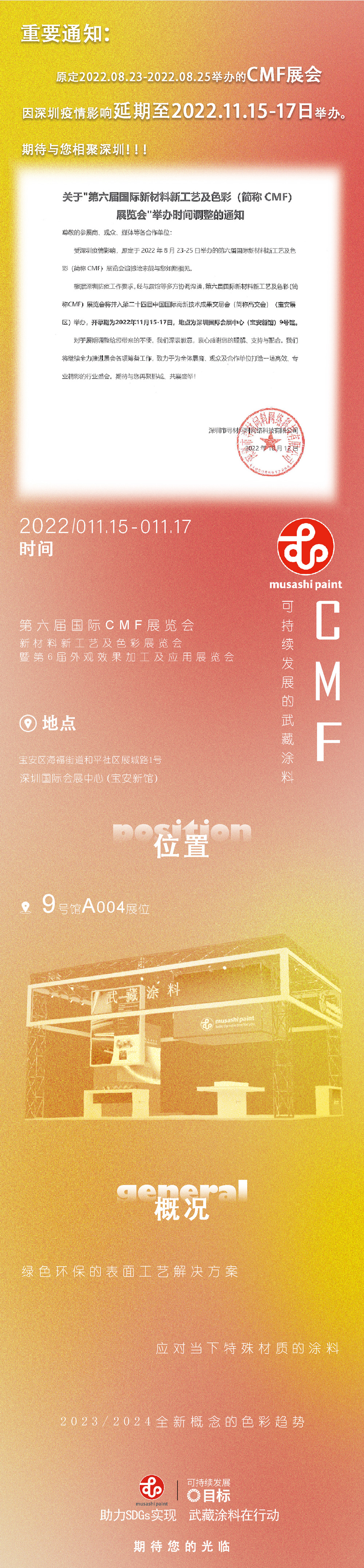 原定2022.08.23-2022.08.25举办的第六届CMF展会因深圳疫情影响延期至2022.11.15-2022.11.18日举办。地点为深圳国际会展中心(宝安新馆)9号馆A004展位。武藏涂料恭候您的光临!
